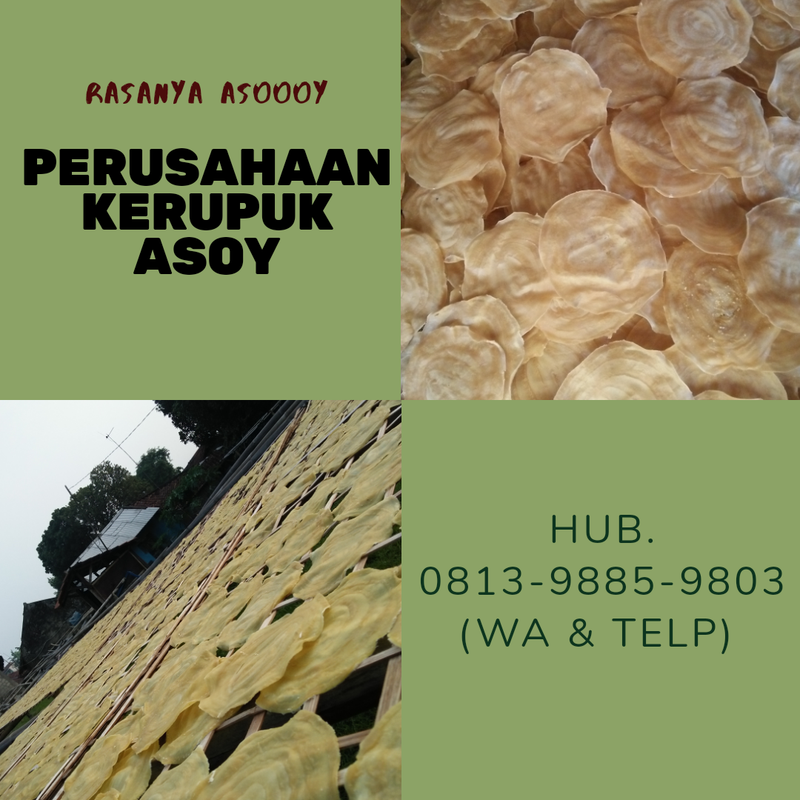 Usaha Kerupuk Asoy kebanyakan di bua sama ibu - ibu, contohnya yang menganggur di desa halamannya.beserta memilih melaksanakan kerajinan Kerupuk Asoy selama menggunakan waktu luangnya melalui cara melaksanakan Kerupuk Asoy ini. Dan selain itu, yang cukup membuat semangat para perusahaan Kerupuk Asoyini ialah lingkungan pemasarannya yang begitu besar . Oleh karena itu, Kerupuk Asoy luas yang meminta pada suatu perusahaan sekali memesan selalu menta pada nilai barang yang berlebihan.